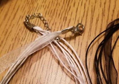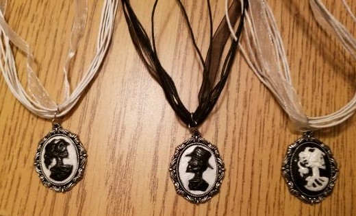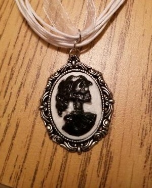 Skeleton cameo necklaces, touched up by hand. The cords have six normal strands and one normal ribbon, and they're about 20 cm long with fishhook clasps.