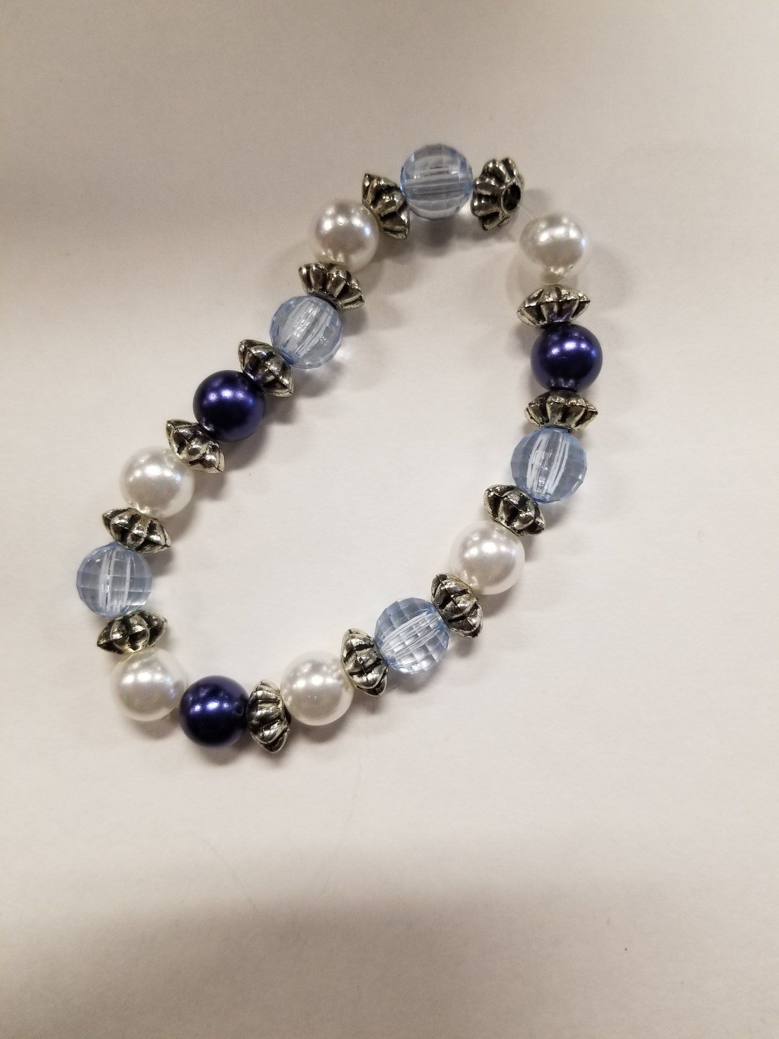 A stretchy beaded bracelet, fits most sizes (exact measurements TBA), with acrylic beading. Hand-strung with elastic.